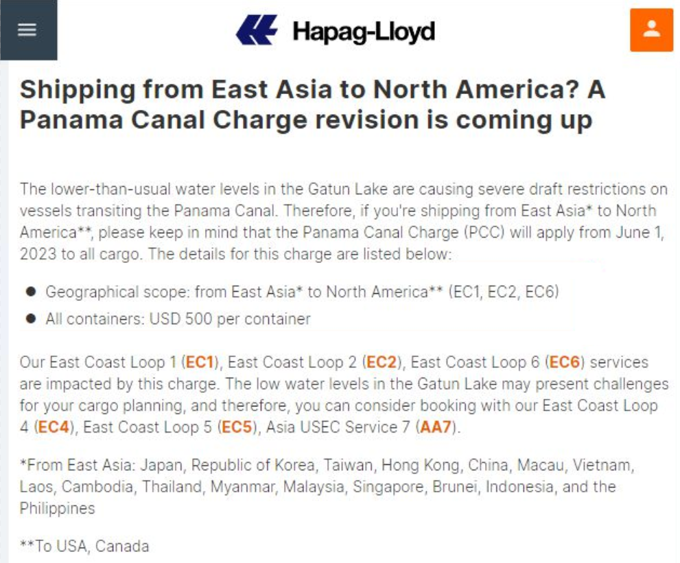 2023年6月1日起,针对从东亚运输到北美的所有货物征收巴拿马运河附加费PCC(PANAMA CANAL CHARGE)。有关收费的详情如下: